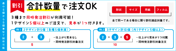 形状、サイズ、用紙、フィルムなどが完全に同じ仕様の場合、3種類までまとめた個数でご注文いただくことで、1個当たりの単価を下げられます。(同時作成割引) 同じ形状、サイズでも、別用紙で作成する場合は個別にご注文お願い致します。