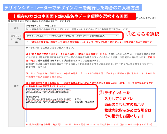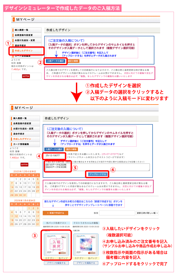 デザインシミュレーターでデータ作成された場合はマイページよりご入稿が可能です(このページ下部にご入稿方法の記載イラストがあります)
